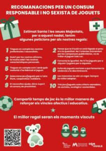 D’aquesta manera, s’han difós cartells amb una sèrie de recomanacions per a la compra de joguets, com tindre en compte les preferències, aficions, característiques personals i edat dels menors; triar joguets sota criteris raonables, no sexistes, sostenibles i que no fomenten la violència o la discriminació; seleccionar aquells joguets que promocionen la igualtat; o no comprar animals, perquè sempre és millor adoptar.