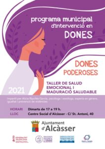 L’Ajuntament d’Alcàsser, a través de l’àrea d’Igualtat, ha posat en marxa un programa municipal d’intervenció en dones. Sota el lema, ‘Dones Poderoses’, cada dimarts, de 17.00 a 19.00 hores, les dones interessades assistiran a un taller de salut emocional i maduració saludable, que té com a objectiu l’autoconeixement i l’apoderament femení.