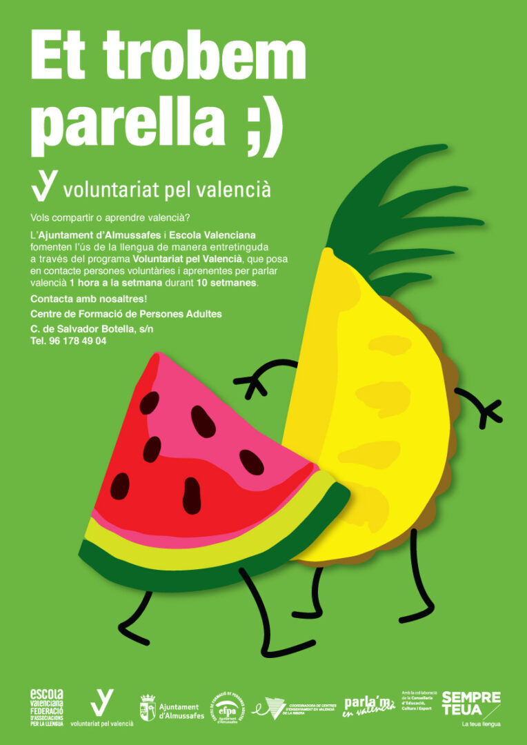 En l’edició passada van ser sis les parelles que van formar part del programa. Enguany, sota el lema ‘Et trobem parella’ l’Escola Valenciana, juntament amb l’Ajuntament d’Almussafes i sota la coordinació del professorat del Centre Municipal de Formació de Persones Adultes (CMFPA) pretenen fomentar l’aprenentatge del valencià a través del programa ‘Voluntariat pel valencià’.
