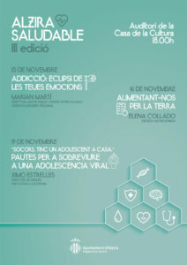 El dilluns 15 de novembre donarà inici una nova edició d’Alzira Saludable, una iniciativa que la Regidoria de Sanitat de l’Ajuntament d’Alzira recupera després de dos anys inactiva per a promoure la salut, per mitjà del debat i la difusió de missatges i continguts que ajuden a la població a encarar els episodis de malalties amb coneixements gràcies als consells oferits pels especialistes. L’auditori de la Casa de la Cultura acollirà les ponències d’esta tercera edició d’Alzira Saludable, que començaran a les 18 hores.
