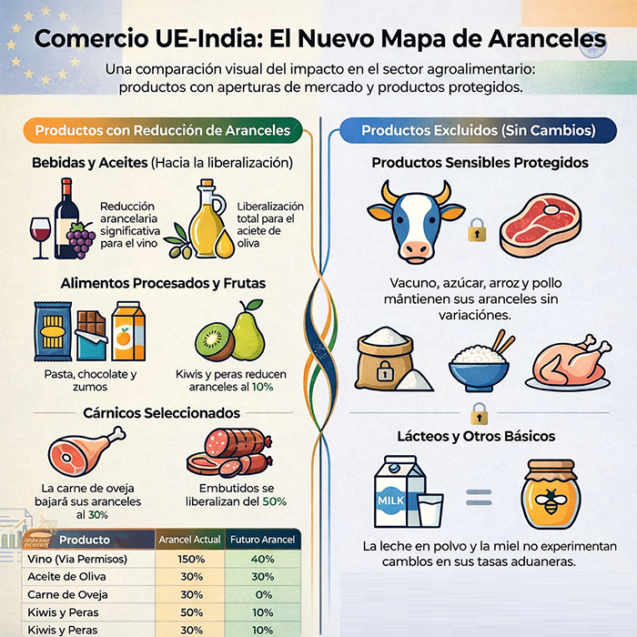 L’acord obri oportunitats per a sectors com el vi i l’oli d’oliva, que veuran reduïts els aranzels que fins ara superaven el 150 % en el cas del vi i el 45 % en l’oli d’oliva. AVA-ASAJA reconeix l’interés d’accedir a un mercat de més de 1.400 milions de consumidors, especialment per a produccions d’alt valor afegit.