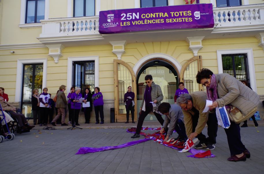 El Dia Internacional Contra la Violència de Gènere es va reivindicar a Godella amb una concentració a la porta de la casa de la vila. A les 12 hores del 25 de novembre acudien a la cita regidores, regidors, personal de l’Ajuntament i un bon grapat de veïns i veïnes. Destacaven les tres associacions de dones del poble. Acompanyades per les dones grans de la residència La Saleta, A Cada Lluna, les Ames de casa Tyrius i Mujeres por la calidad de vida van col·laborar activament –una vegada més— amb la lectura de poemes contra la violència de gènere. La Jove Companyia Gerard Collins s’encarregava de donar el toc més fresc, amb una actuació de dansa a càrrec d’alumnes del seu programa de formació intensiva. Al final, seguint una iniciativa de l’artista Elina Chauvet, van ser homenatjades les dones assassinades a Espanya durant 2019, amb una sabata roja per cadascuna d’elles.