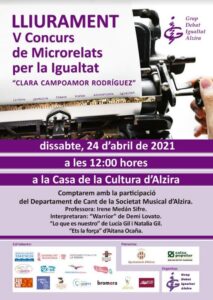 El pròxim dissabte es lliuraran els premis del V Concurs de Microrelats per la Igualtat “Clara Campoamor Rodríguez L’acte que tindrà lloc a la Casa de la Cultura a les 12 h, comptarà amb la lectura dels microrelats i amb l’actuació de l’alumnat de cant de la Societat Musical d’Alzira.