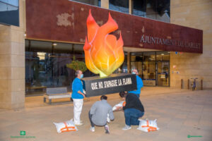 La flama fallera, obra dels artistes locals Ivan i Vicent Martínez Velló, ja està plantada a Carlet. La figura , de dos metres d’alçària, s’ha plantat com a testimoni de les set comissions falleres que enguany no plantaran els seus monuments, que a hores d’ara queden guardats en un magatzem municipal.