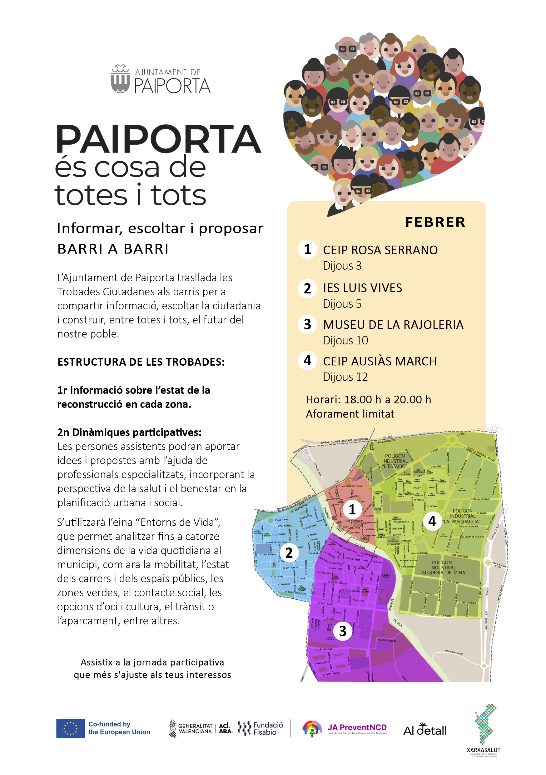L’Ajuntament de Paiporta inicia la segona fase del procés de reconstrucció a través de trobades presencials per barris, amb dates i espais ja definits durant el mes de febrer. L’objectiu és escoltar directament la ciutadania i recollir propostes concretes per millorar cada zona del municipi.