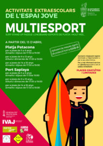 Per a les activitats de multiesport es compta amb la col·laboració de les escoles esportives del municipi Mediterranean Surf School i Xsa Surf, i hi haurà grups des dels 5 als 18 anys. Es realitzaran a les platges de la Patacona i Port Saplaya. L’horari serà a partir del 13 d’abril, el grup de 5 a 8 anys, dimarts i dijous de 17:30h. A 19:00h. Per al grup de 9 a 13 anys, dilluns i dimecres de 17:30h. A 19:00h. I finalment, el grup de 14 a 18 anys, dimarts i dijous de 17:30h. A 19:00h.