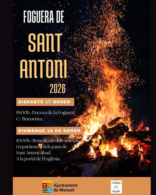 La Regidoria de Festes de l’Ajuntament de Manuel ha informat de la celebració dels actes tradicionals de Sant Antoni, que tindran lloc els dies 17 i 18 de gener al municipi.