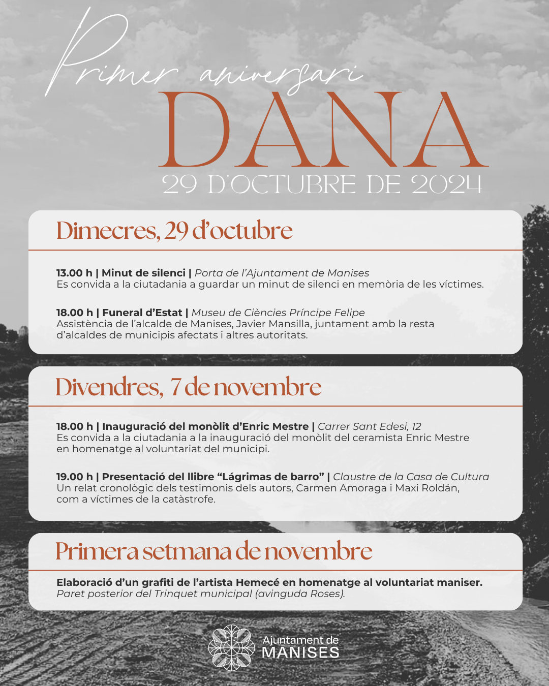 Manises, 28 d’octubre de 2025. – L’Ajuntament de Manises ha organitzat diverses activitats per a recordar el primer aniversari de la DANA del 29 d’octubre de 2024, un episodi que va deixar una profunda empremta en el municipi i en tota la comarca.