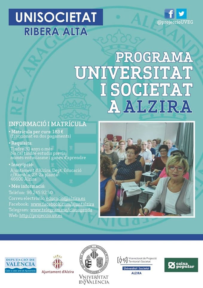 Alzira encetarà el proper mes de setembre la quarta edició d’Unisocietat. Este programa de formació al llarg de la vida que oferix l’Ajuntament d’Alzira i la Universitat de Valencia, està dirigit a majors de 30 anys amb inquietud per aprendre i motivació per la cultura. L’objectiu d’este tipus d’itinerari formatiu