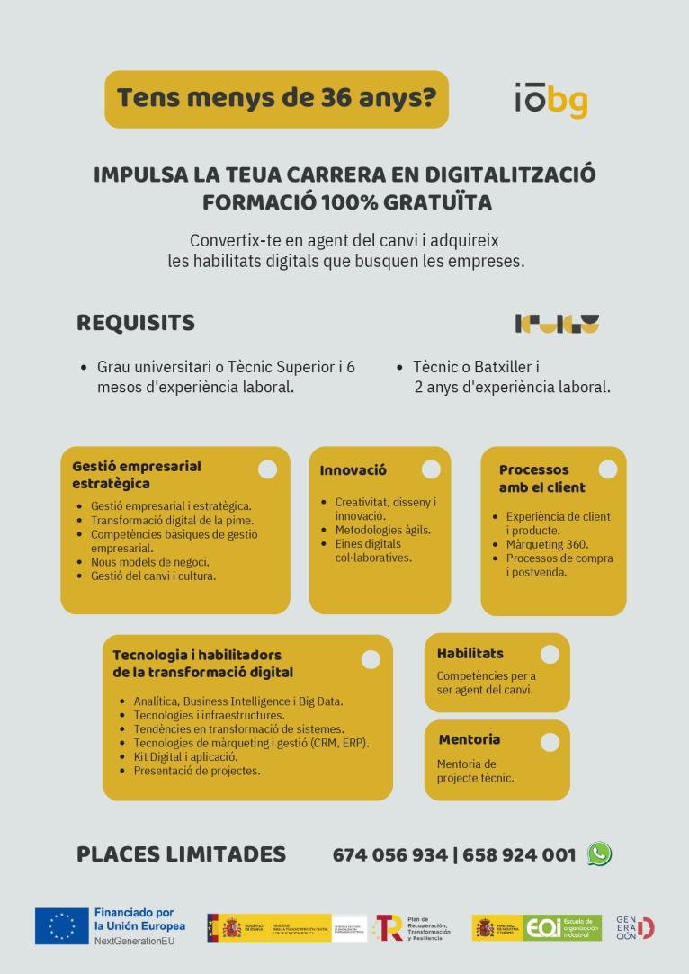 La Regidoria de Joventut de l’Ajuntament de Sueca, a través de la consultoria IOBG ‘Agents del canvi’, oferix a la població jove del municipi la possibilitat de beneficiar-se d’una formació gratuïta destinada a impulsar la seua carrera en l’àmbit de la transformació digital.