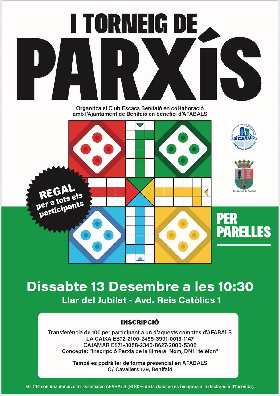 El Club d’Escacs Benifaió posa en marxa dos esdeveniments esportius solidaris amb l’objectiu de recaudar fons a favor d’AFABALS, l’associació que presta suport a les persones afectades per l’Alzheimer i a les seues famílies. Aquesta iniciativa combina oci, esport i solidaritat, oferint a la ciutadania l’oportunitat de passar una jornada lúdica mentre col·labora amb una causa social de gran importància.